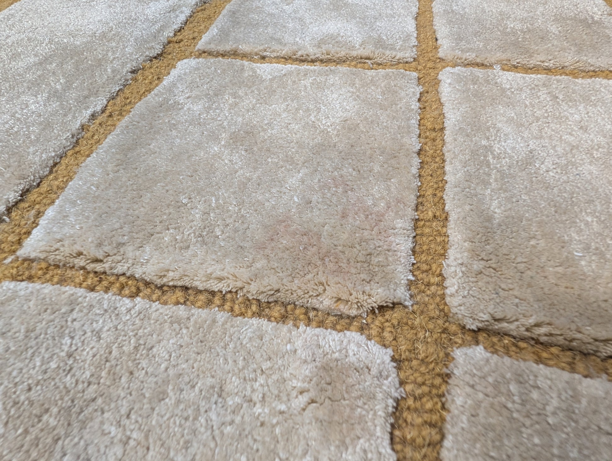 Tous nos tapis sont réalisés à la main. De ce fait, de légers reflets donnant l’impression de variations de couleurs peuvent apparaître selon l’éclairage et l’angle sous lequel le tapis est regardé. Cette impression est normale.
