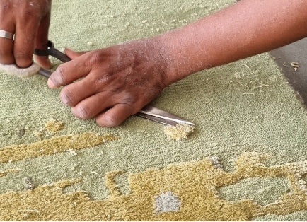 S’ensuivent alors les différentes finitions qui sont réalisées à la main comme le rasage des boucles, le ciselage des formes et la réalisation du surjet tout autour du tapis pour donner à votre projet, toute sa singularité et son élégance.